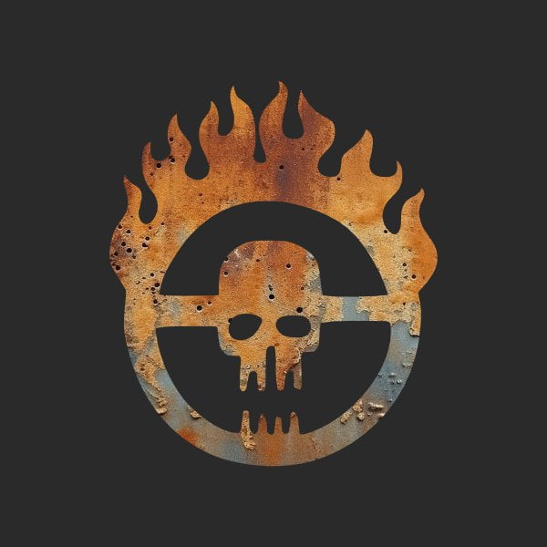 El símbolo de los War Boys, con su diseño inquietante de una calavera en un volante alado sobre metal oxidado, es un emblema de lealtad y ferocidad. El corte preciso en el vinilo destaca cada detalle del diseño, desde los contornos nítidos de la calavera hasta las alas estilizadas, evocando la estética salvaje y sin ley del universo de Mad Max.